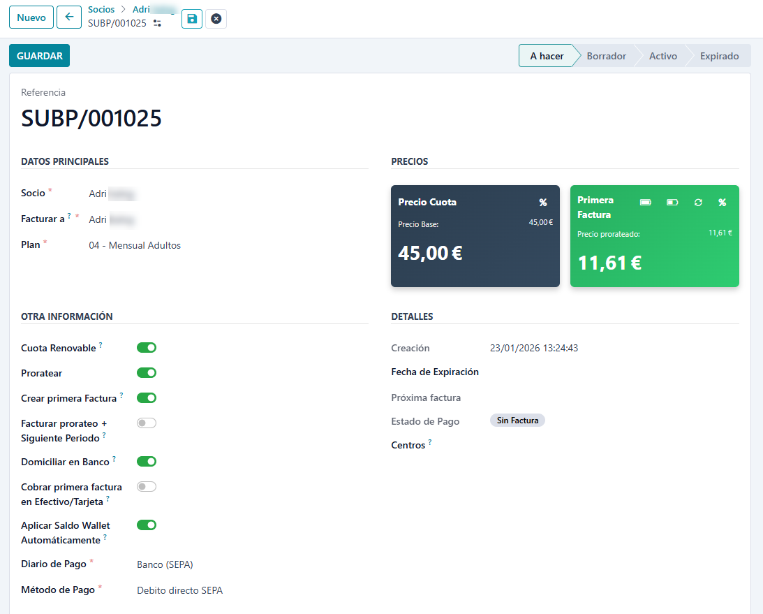 Al crear la cuota, se genera una primera factura con el importe correspondiente hasta final de mes. La siguiente factura se generará el día 1 del mes siguiente.
