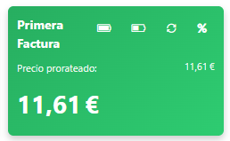 Los cambios realizados en el widget verde de prorrateo solo afectan a la primera factura. Si deseas aplicar un descuento recurrente en la cuota, deberás configurarlo en el widget de la izquierda, de color azul oscuro.