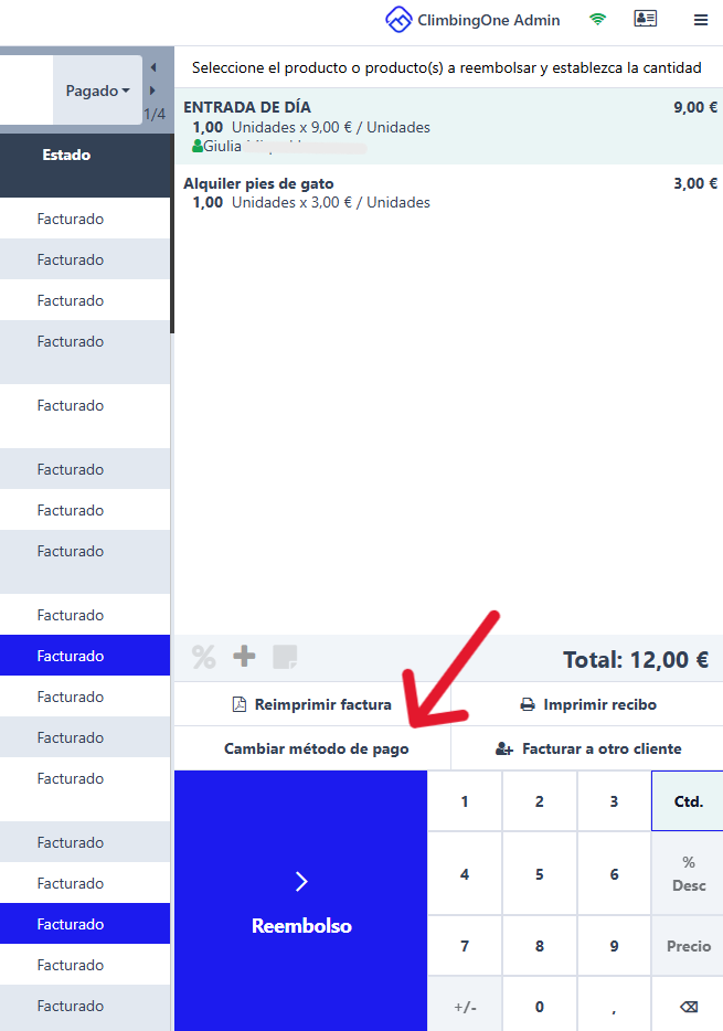Para cambiar el método de pago, selecciona la venta que quieras actualizar. Una vez la selecciones, aparecerán todos los artículos de la venta en la derecha de la pantalla, sobre la calculadora. Presiona el botón de "Cambiar método de pago", sobre el cuadrado azul