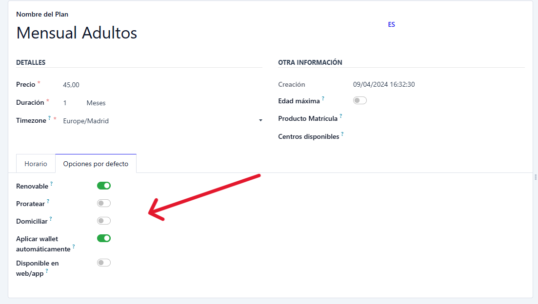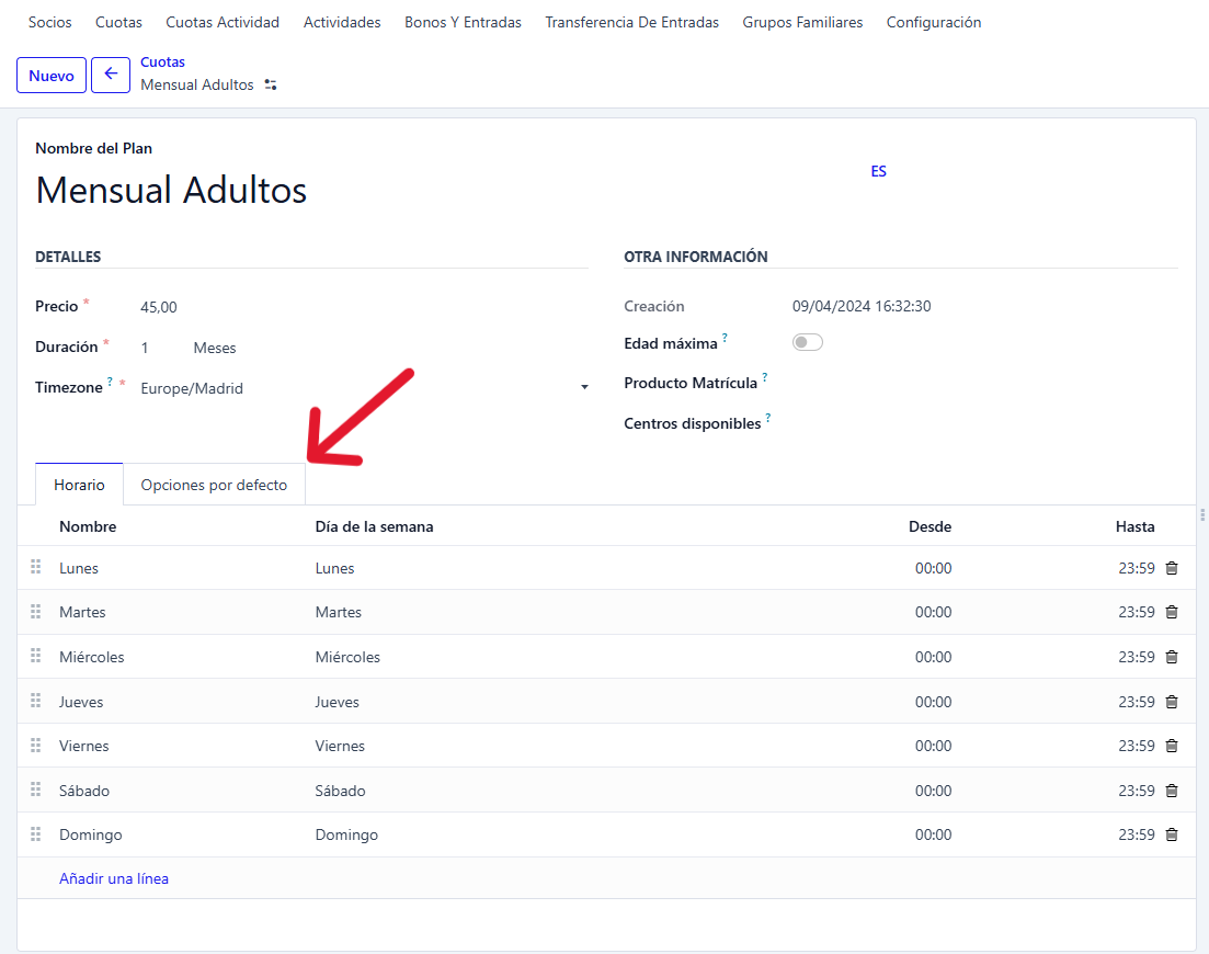 Dentro de la cuota o cuota de actividad, dirígete a la pestaña de "Opciones por defecto"