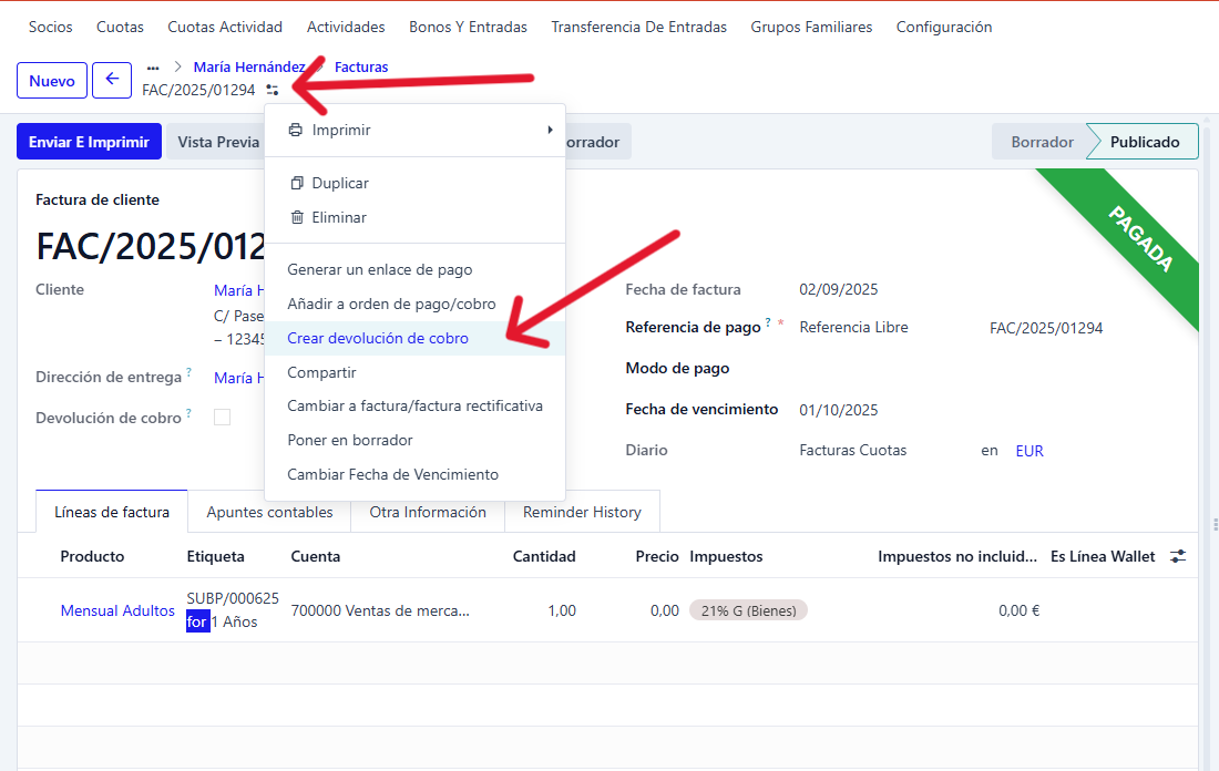 Selecciona la factura que quieras marcar como impagada y dirígete al botón de "Acciones". Selecciona "Crear devolución de cobro"