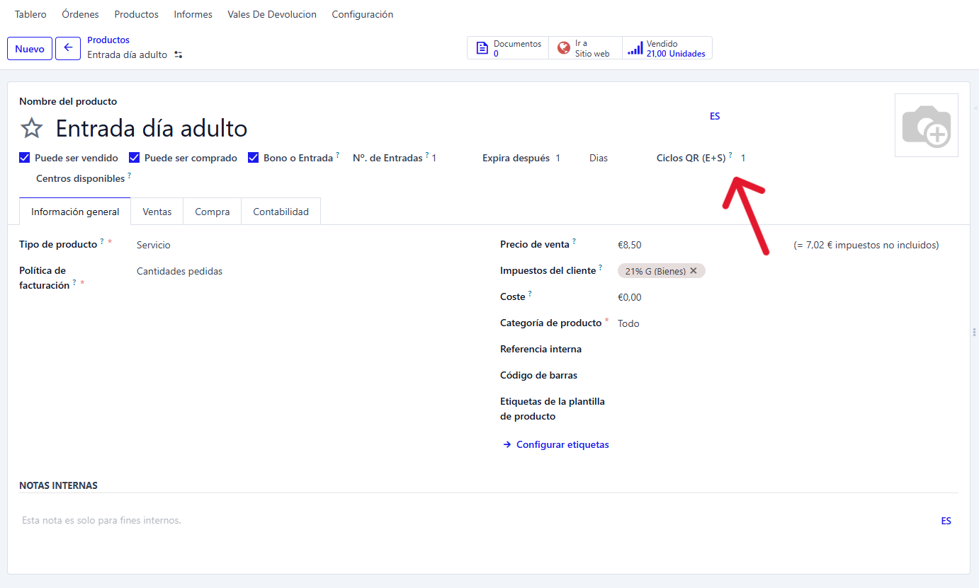 En el apartado "Ciclos QR (E+S)" selecciona el número de accesos del que quieres que disponga la entrada.