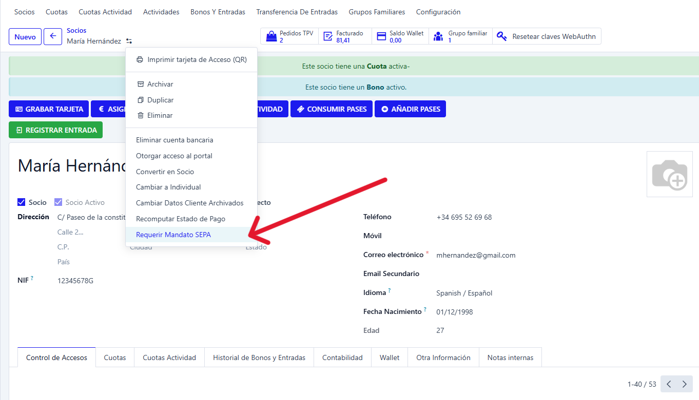 Para enviarlo, dirígete al perfil del cliente. Desde el botón de "Acciones", selecciona "Requerir mandato SEPA".