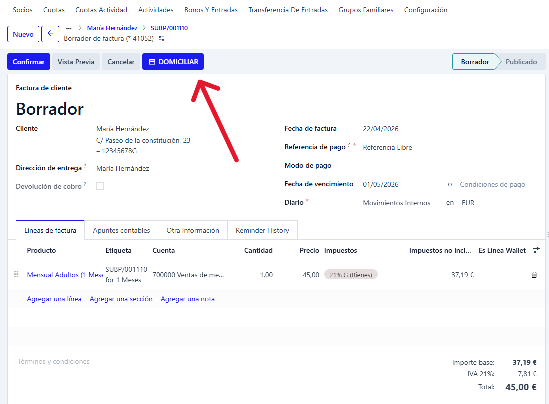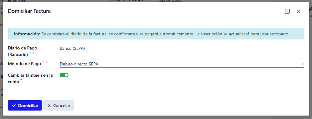 Desde ClimbingOne, se puede domiciliar una factura que no lo estaba, o desdomiciliar una factura que está domiciliada. Se puede realizar siempre y cuando no hayan sido cobradas o incluidas en una remesa.