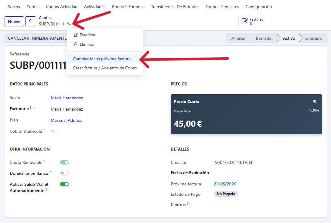 Una vez en la cuota, pincha sobre el botón de acciones, y selecciona la opción de "Cambiar fecha próxima factura".