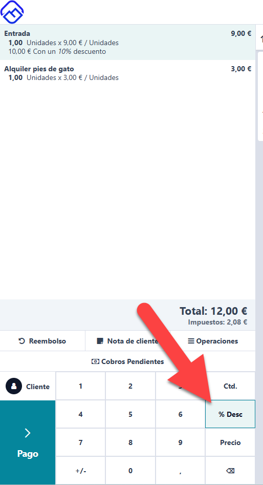 Si deseas realizar un descuento, selecciona la opción "% Desc" situada a mano derecha de la calculadora. Selecciona el producto e introduce en la calculadora el número de porcentaje de descuento que quieras aplicar (Ej: si introduces "10" en la calculadora, se realizará un 10% de descuento sobre el precio del artículo que hayas seleccionado)