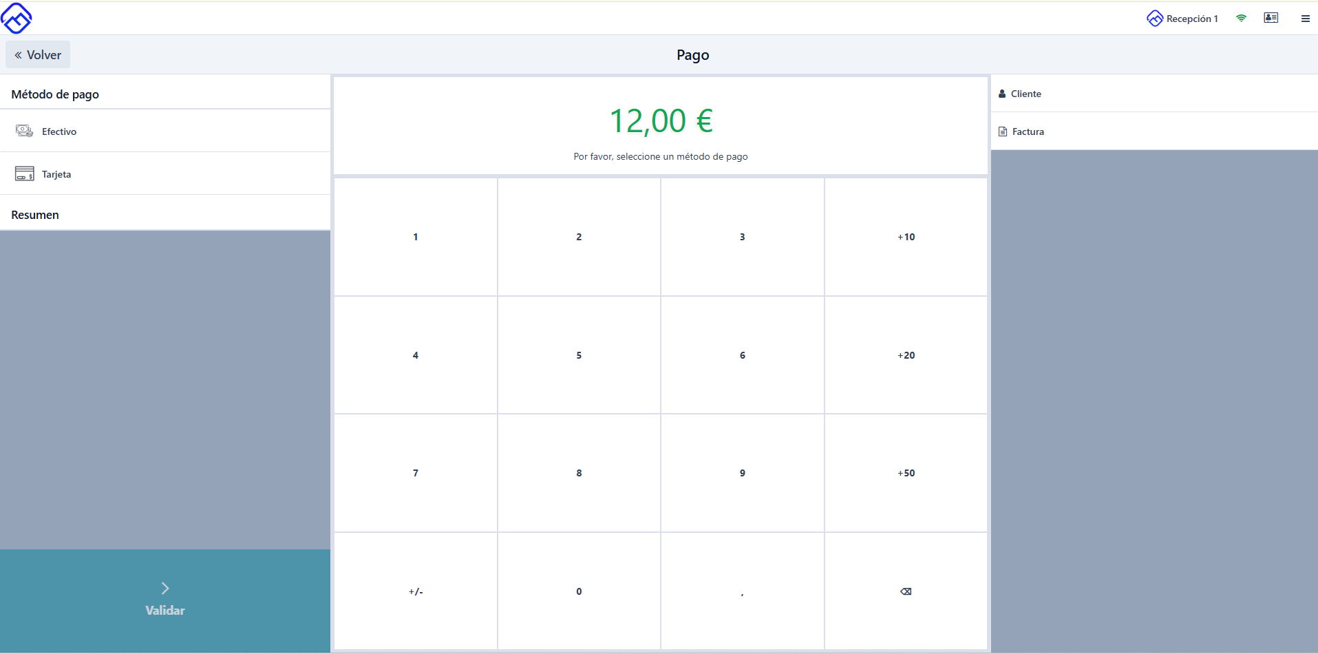 Una vez quieras proceder al pago, presiona el botón de "Pago" situado abajo a la izquierda. Después selecciona el método de pago (Tarjeta o efectivo) y presiona "Validar" abajo a la izquierda